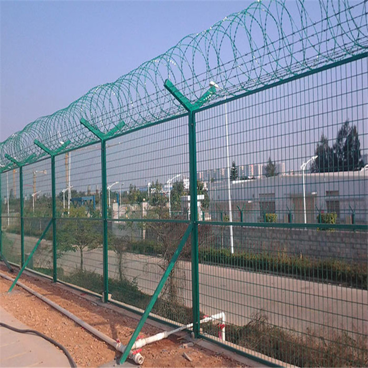 飞行区钢筋网围界特点:具有很好的抗老化、抗晒、耐候等特点。其产品造型美观、花色多样,既起到围栏作用,又起到美化作用。由于具有安全性高、防攀爬能力好,网片连接方式采用特制SBS紧扣件,有效防止人为的破坏性拆卸,横向四道折弯加强筋,使网面强度显著增加。选用低碳钢丝编制焊接而成,具有美观、实用、方便运输和安装的特点。在机场隔离网的横向加装四道折弯加强筋,在整体成本增加不多的同时,使网面强度和美感显著增加,是目前国内外受欢迎之一。
