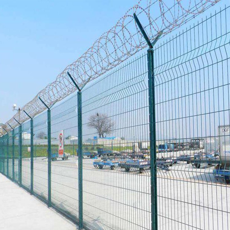 机场围界网首先进取相对应的原材料,一般机场护栏的立柱为2.5米高,立柱方管采用镀锌方管60mm,4mm厚,Y型头为500mm的,垂直高度为3.46米,立柱为预埋柱,网框为50x50x5mm镀锌角铁,丝径为丝中到丝中50mmx100mm塑前的粗度5mm的丝,V字网与网框网片丝径丝粗相同,刺绳为60mm直径圆的热镀锌刀片刺绳,整体浸塑为墨绿色,浸塑采用塑粉浸塑完成,表面光滑,上塑量高,一般整套2米x3的机场护栏网上塑量高达百分之十左右,刀片刺绳不浸塑。机场护栏网不光是立柱为预埋柱,还每9米设置了一道斜撑,这样有利机场护栏网的稳定性能,是结实实用的优质护栏网。
